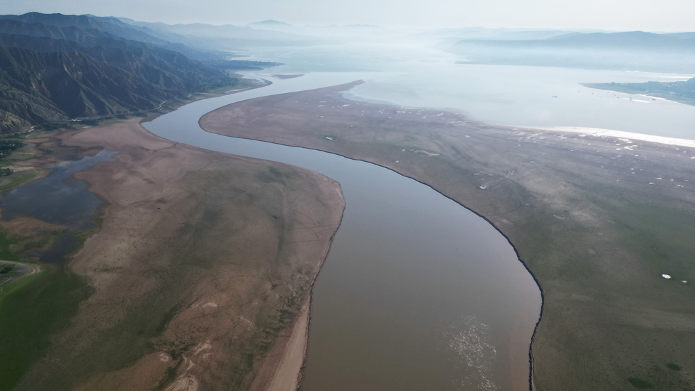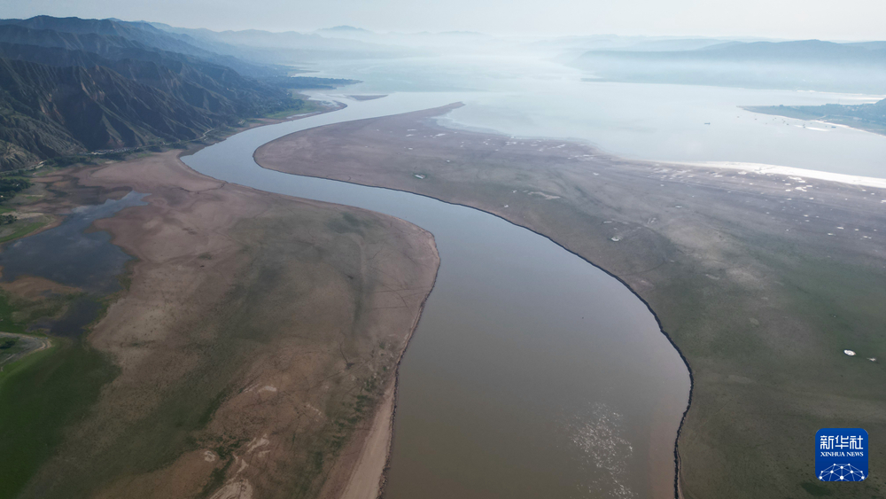 刘家峡水库水位下降,大片河滩裸露(7月24日摄,无人机照片)。