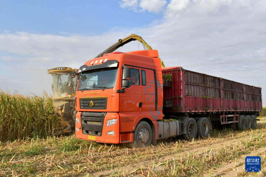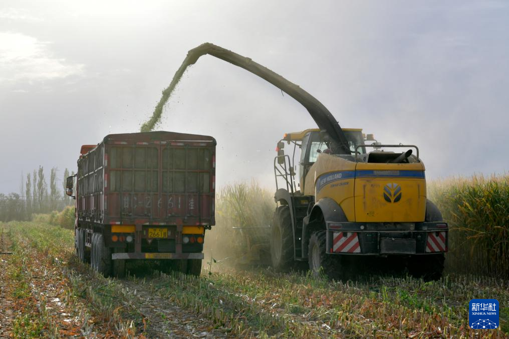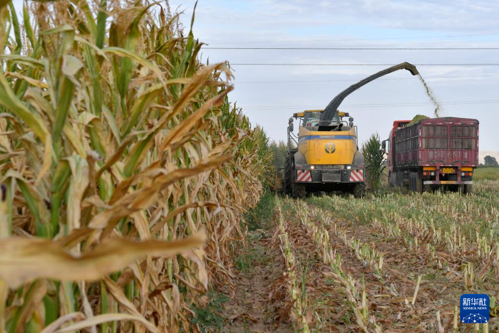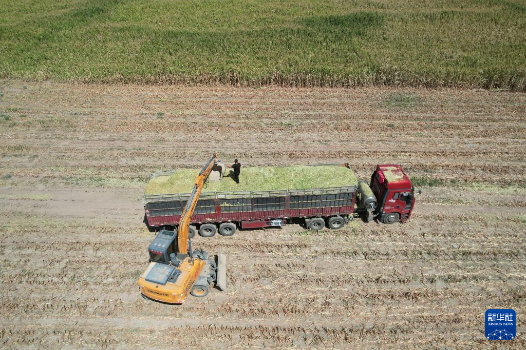 9月5日,在张掖市山丹县位奇镇四坝村,工作人员使用大型机械收获青贮玉米。新华社记者 范培珅 摄