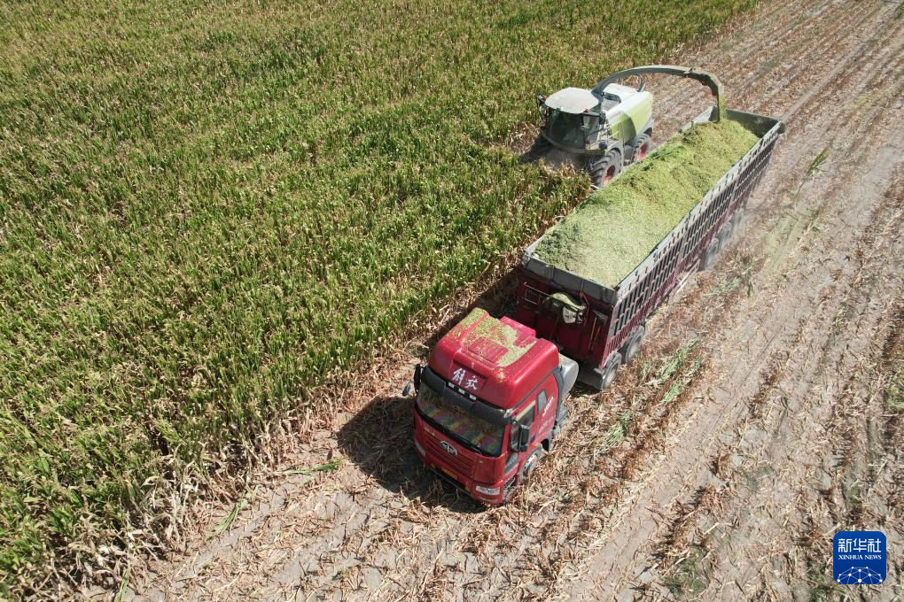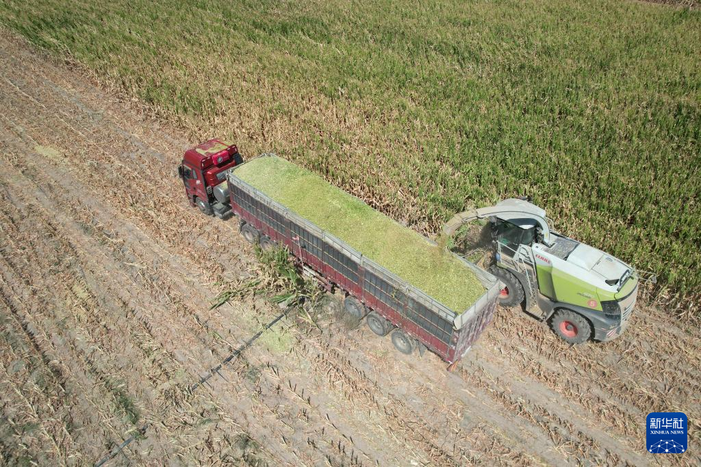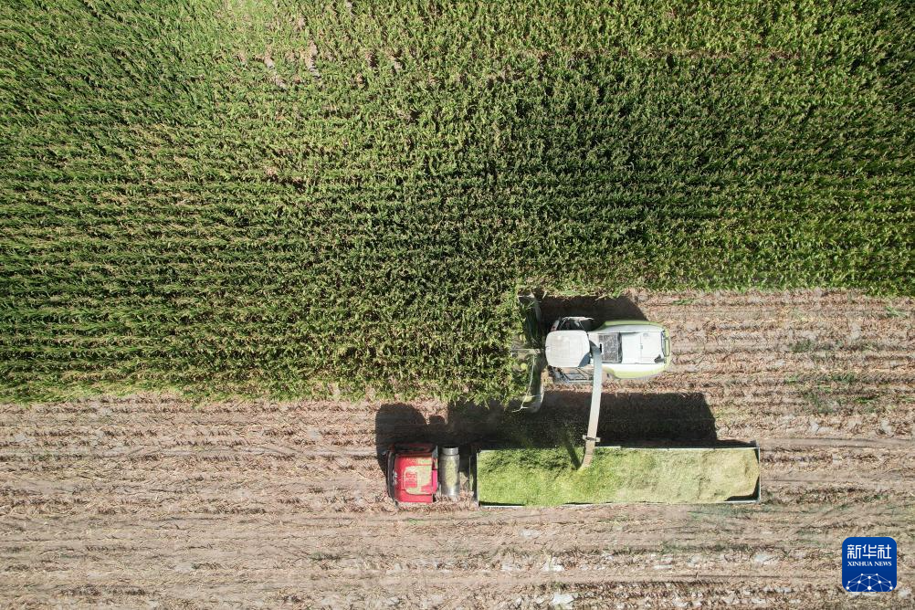 9月6日,在金昌市永昌县六坝镇八坝村,工作人员使用大型机械收获青贮玉米(无人机照片)。新华社记者 范培珅 摄