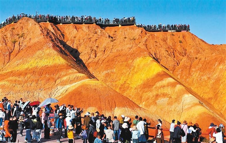 假日期间,张掖七彩丹霞景区内人头攒动,游客尽情欣赏独特的丹霞地貌,领略西北壮美景色。新甘肃·甘肃日报通讯员 王将