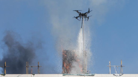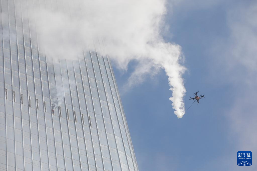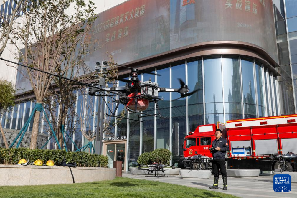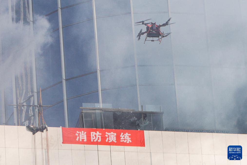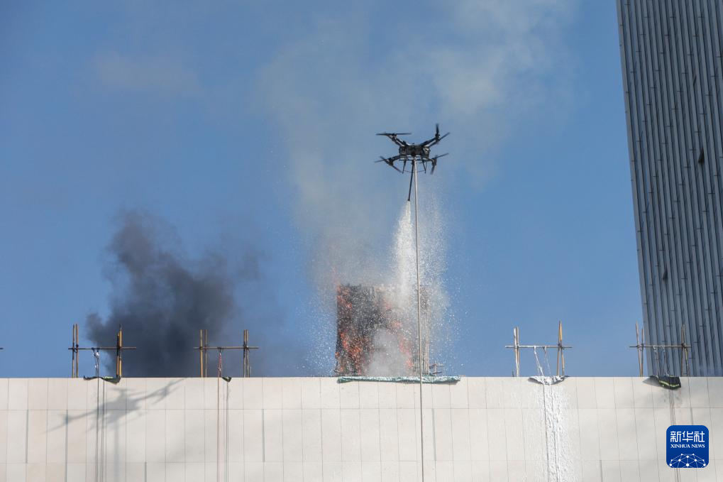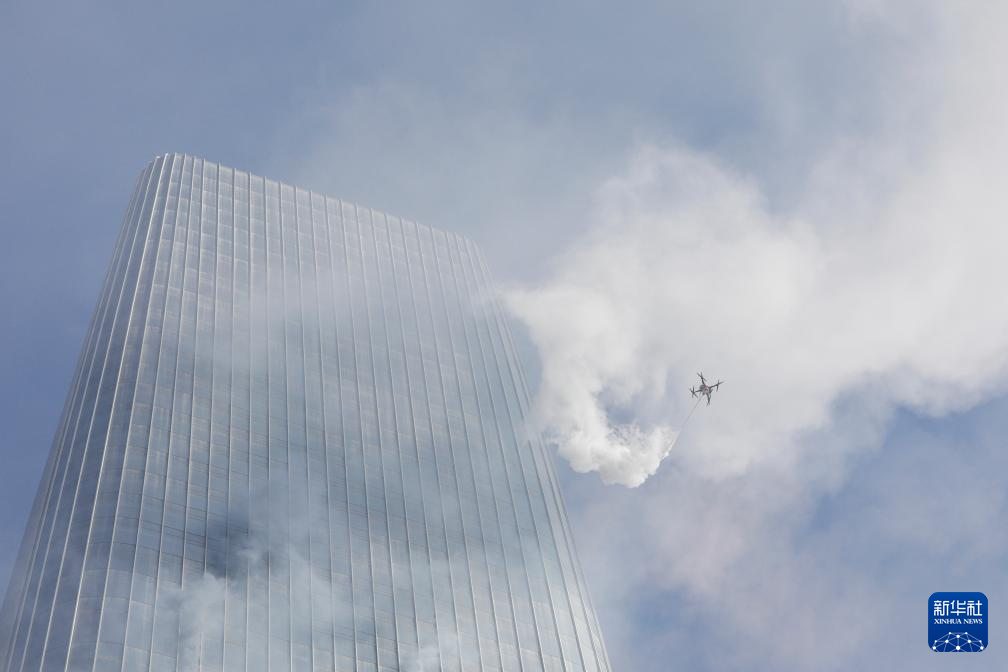 11月8日,高喷灭火无人机进行高层建筑灭火救援实战演练。新华社记者 方欣 摄