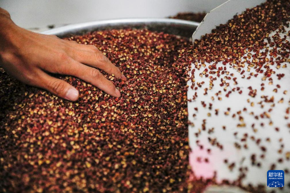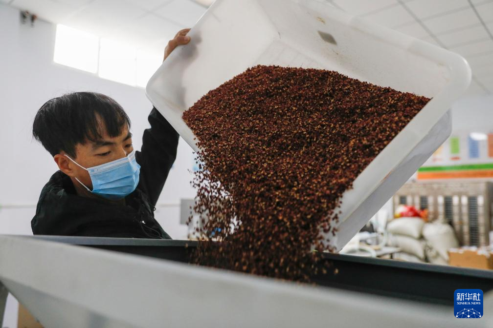 11月15日,在舟曲县电子商务公共服务中心,工作人员将花椒倒入筛选机。新华社记者 方欣 摄