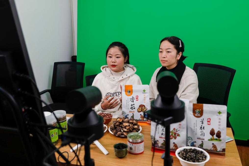 11月15日,在舟曲县电子商务公共服务中心,主播线上直播销售农特产品。新华社记者 方欣 摄