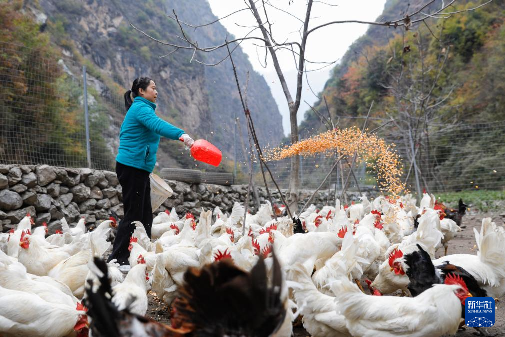 11月15日,在舟曲县峰迭镇狼岔坝村,村民在喂土鸡。新华社记者 方欣 摄