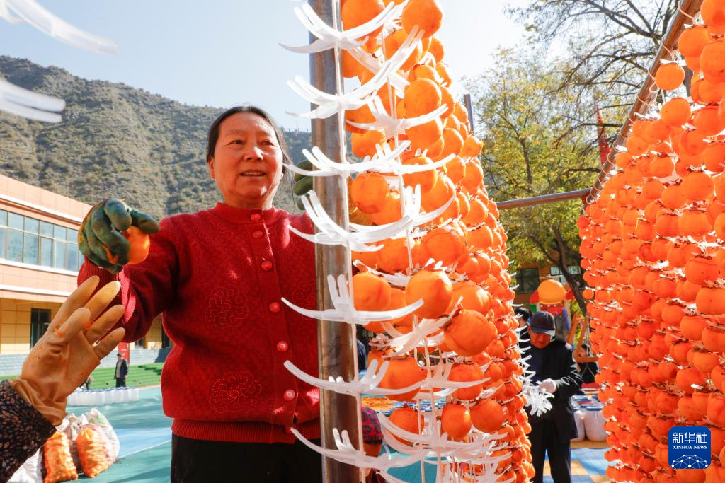 11月14日,在舟曲县立节镇杰迪村,村民在晾晒柿子。新华社记者 方欣 摄
