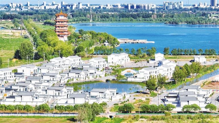 在高台县弱水蒹葭乡村建设示范点,农家小院依次排开,与远处的崇文楼相映成趣。殷旭
