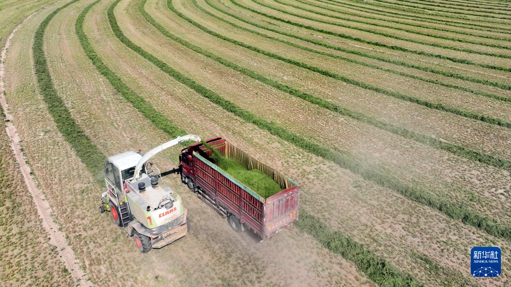 5月27日,自走式饲草粉碎机将刚刚采收的紫花苜蓿粉碎后装车(无人机照片)。新华社发(成林摄)