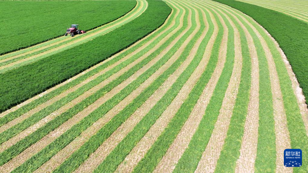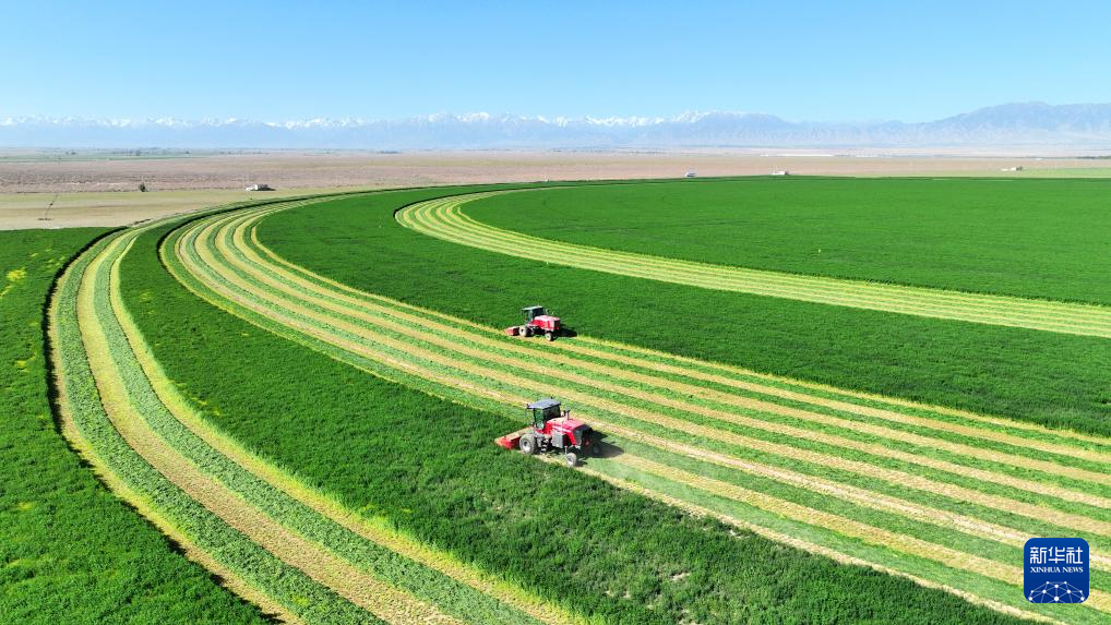 5月27日,大型饲草收割机在采收成熟的紫花苜蓿(无人机照片)。新华社发(成林摄)