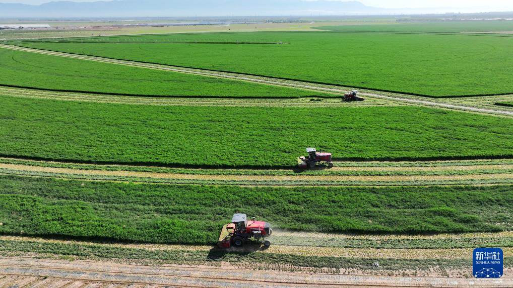 日前,甘肃省张掖市甘州区畜牧产业园内优质饲草基地里的苜蓿开始采收,大型饲草收割机、自走式粉碎机、运输车等来回穿梭,场面壮观。