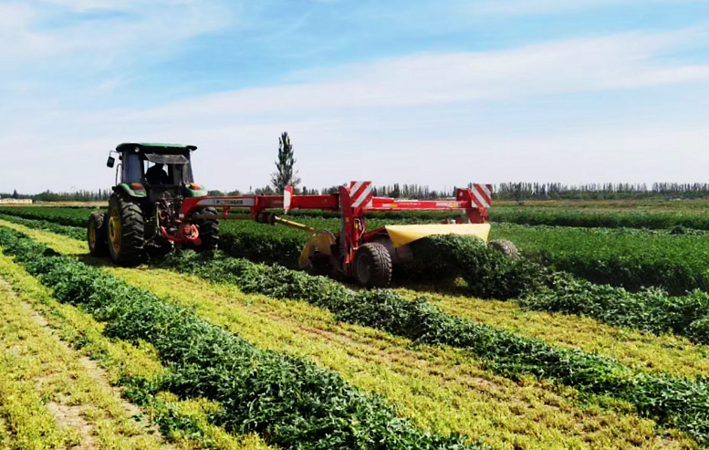 在沙河回族乡河洲村苜蓿田间,大型牧草收割机徐徐驶过,茂盛的“绿色海洋”变成了“条纹地毯”,收割后的苜蓿草通过晾晒、打捆等工序,就变成了牛羊可口的饲料。