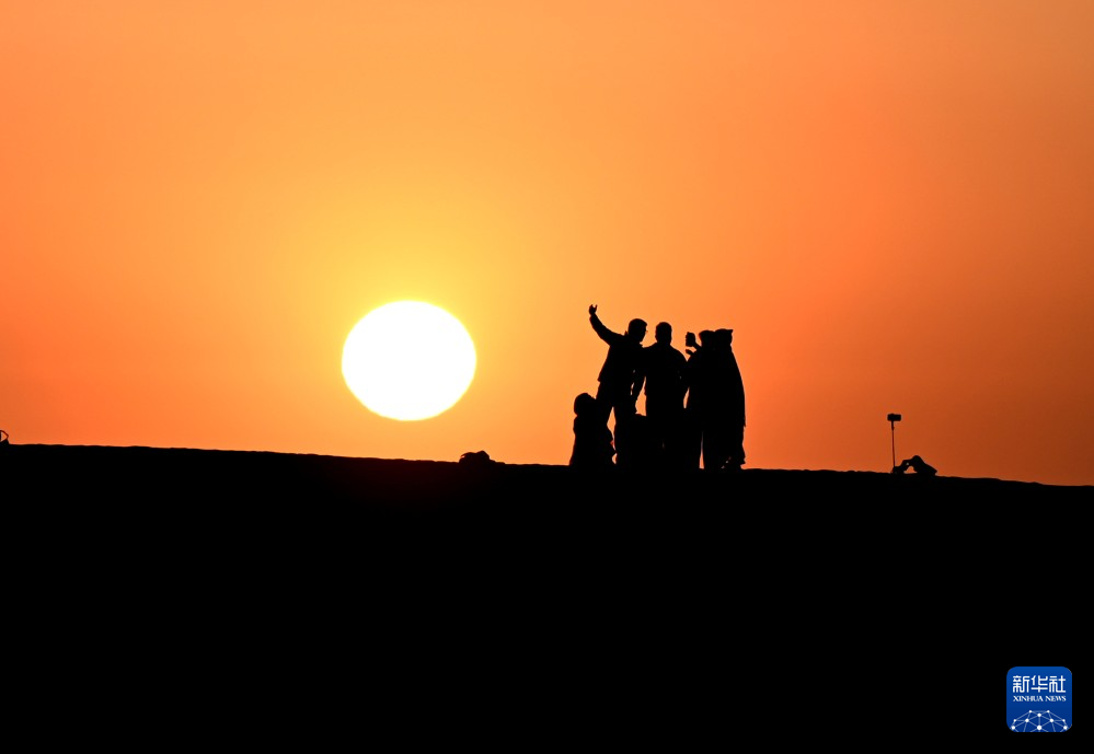 6月14日,游客在甘肃敦煌世界地质公园鸣沙山月牙泉景区观赏大漠日出美景。新华社发(张晓亮 摄)