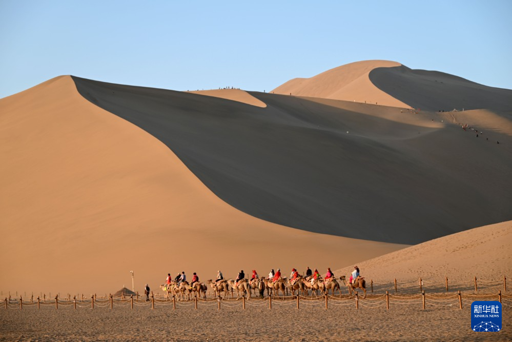 6月14日,游客在甘肃敦煌世界地质公园鸣沙山月牙泉景区游览。新华社发(张晓亮 摄)