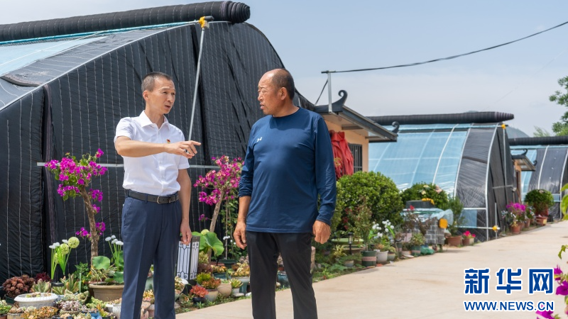 麦国泉(左)在黑池殿村调研新式冬暖大棚情况