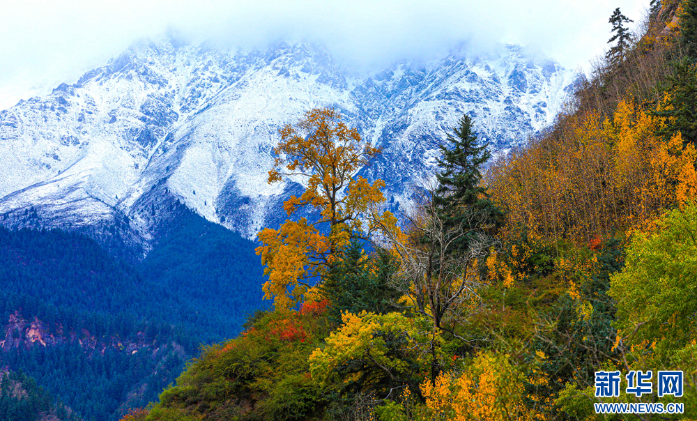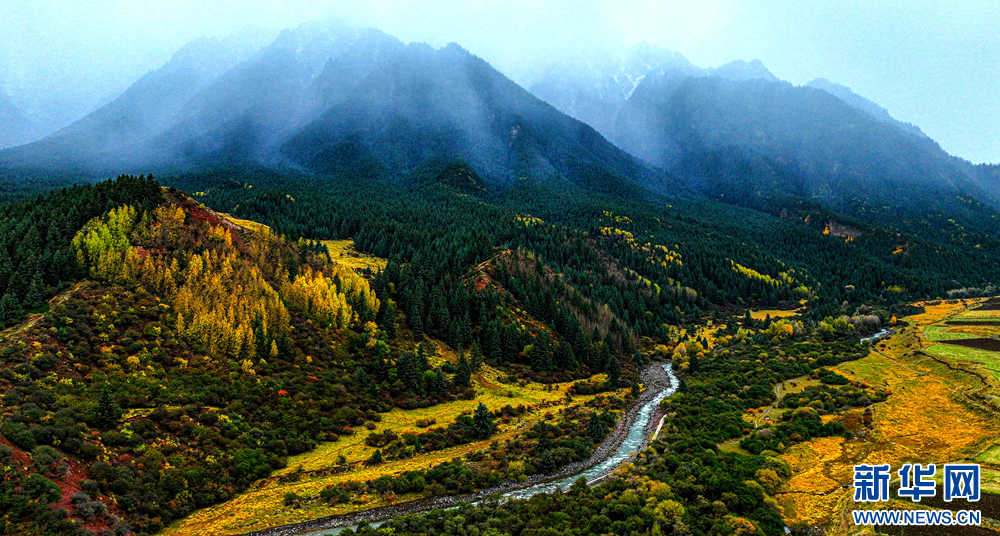 秋日里,祁连山国家公园甘肃省张掖市肃南裕固族自治县马蹄乡段,山顶白雪皑皑,山间云雾缭绕,树木层林尽染,形成色彩斑斓的深秋美景。新华网发(王将 摄)