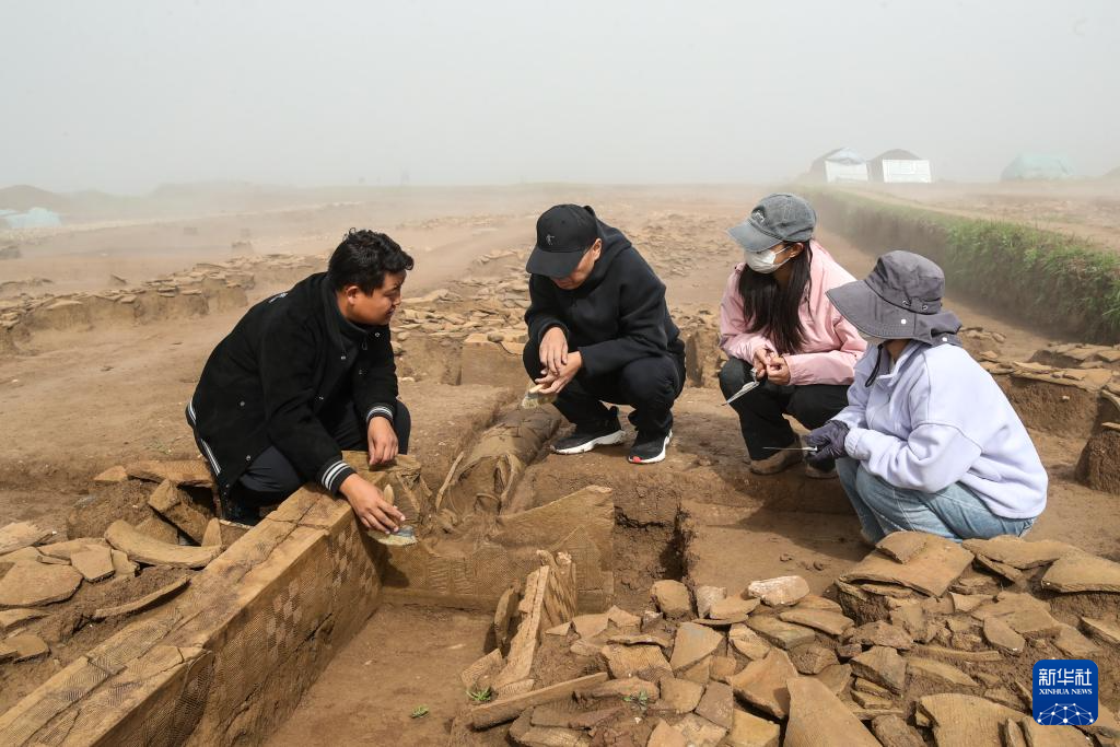 10月15日,在甘肃省陇南市礼县四角坪遗址考古发掘现场,四角坪遗址考古领队、甘肃省文物考古研究所副研究员侯红伟(右二)和考古工作人员探讨一处排水设施遗迹。新华社记者 郎兵兵 摄