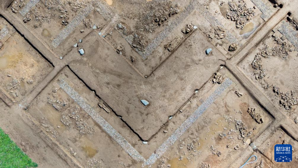 这是10月15日在甘肃省陇南市礼县四角坪遗址考古发掘现场拍摄的一处曲尺形建筑遗迹(无人机照片)。新华社记者 郎兵兵 摄