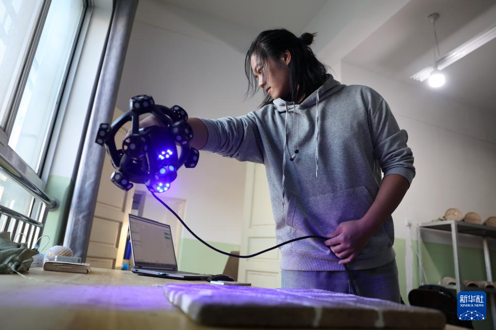 10月15日,技术人员杜言在四角坪遗址考古队驻地对出土文物进行数字化扫描。新华社记者 陈斌 摄