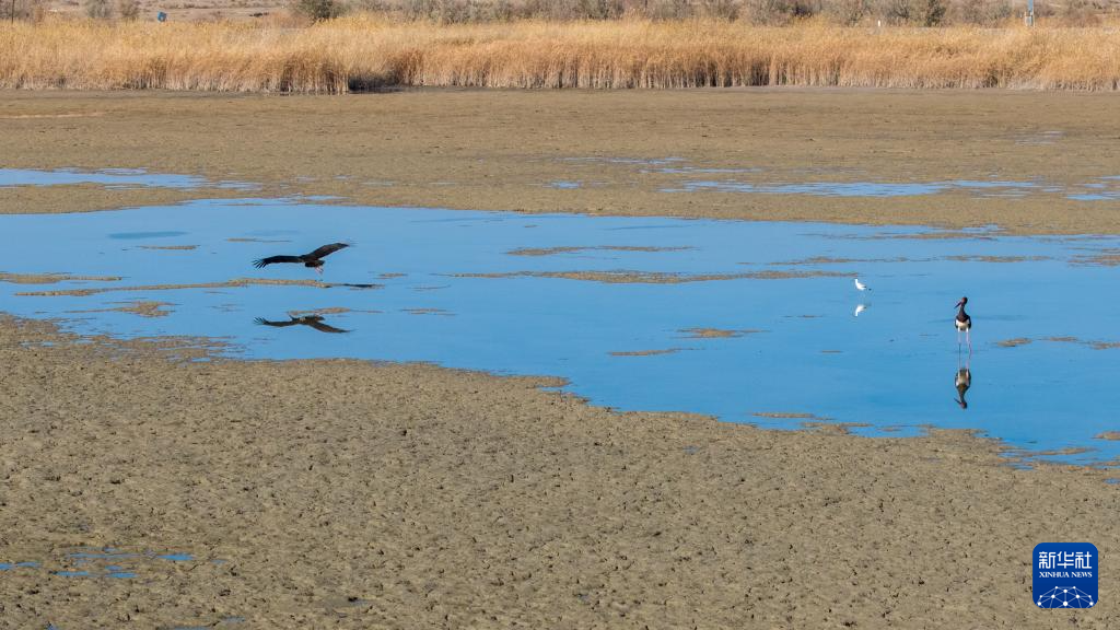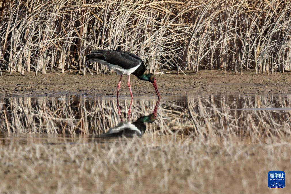 11月12日,黑鹳在张掖黑河湿地国家级自然保护区高台段一处湿地浅滩觅食。新华社记者 郎兵兵 摄