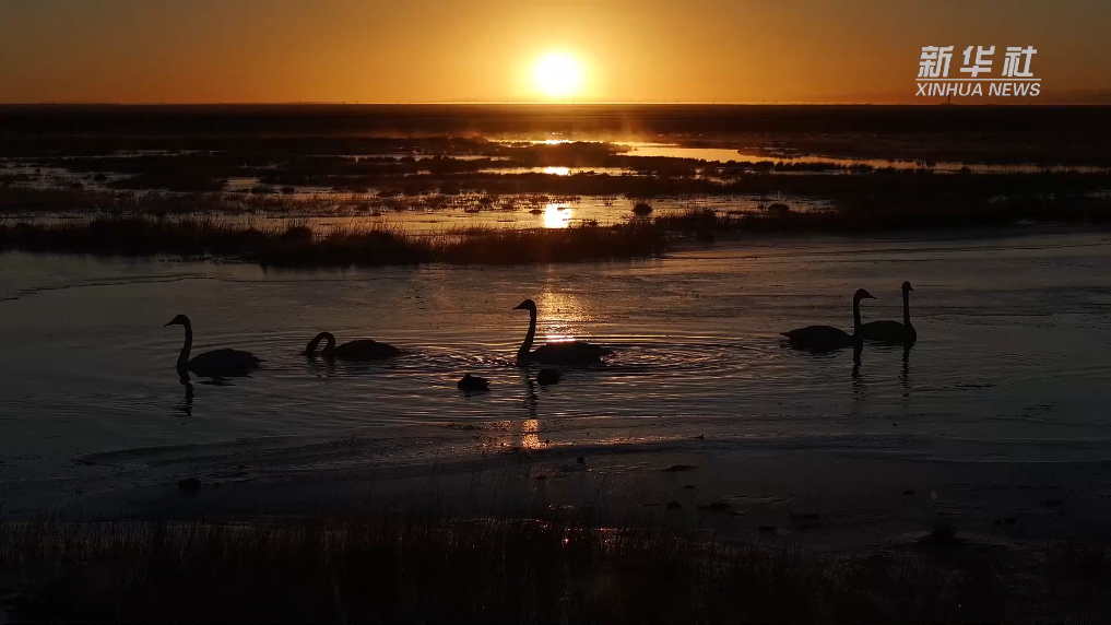 冬日清晨,随着太阳升起,位于甘肃省酒泉市阿克塞哈萨克族自治县境内的小苏干湖湿地迎来了新的一天。