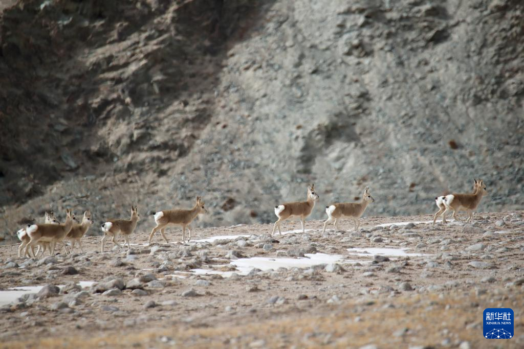 11月14日,国家二级保护野生动物藏原羚在甘肃省阿克塞县阿勒腾乡哈尔腾草原活动觅食(无人机照片)。新华社记者 张智敏 摄