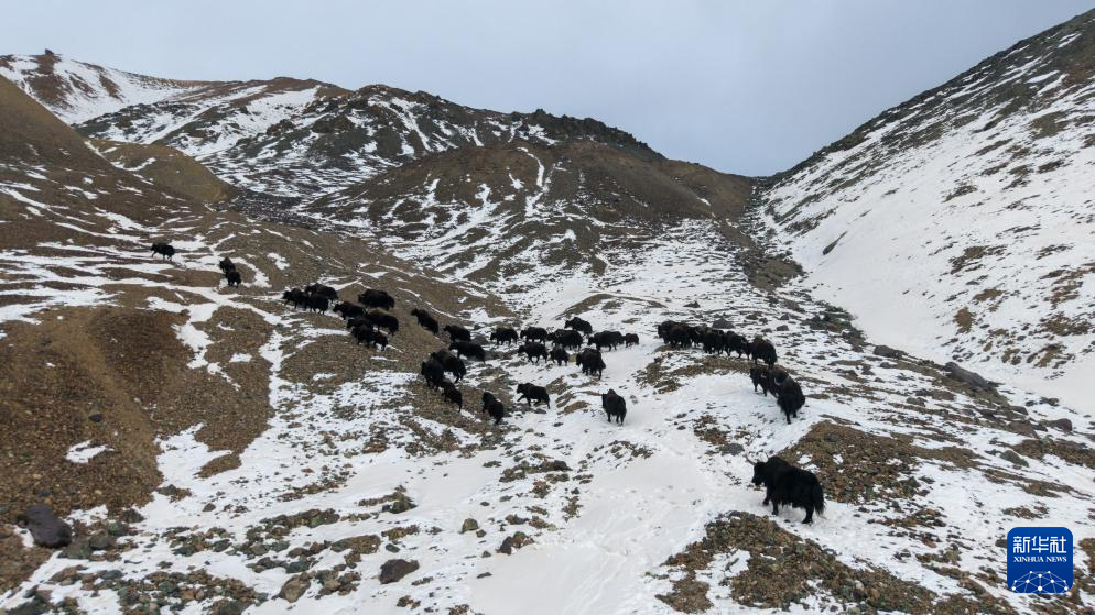11月14日,国家一级保护野生动物野牦牛在甘肃省阿克塞县阿勒腾乡哈尔腾草原的雪山上转场迁徙(无人机照片)。新华社记者 张智敏 摄