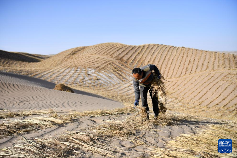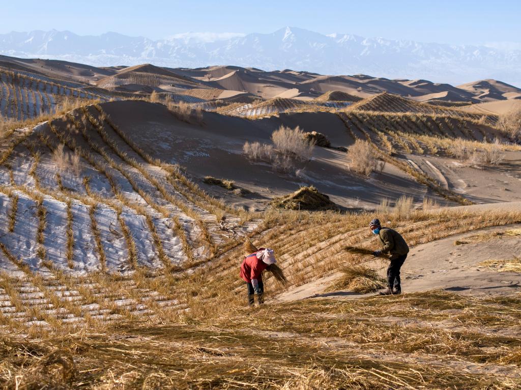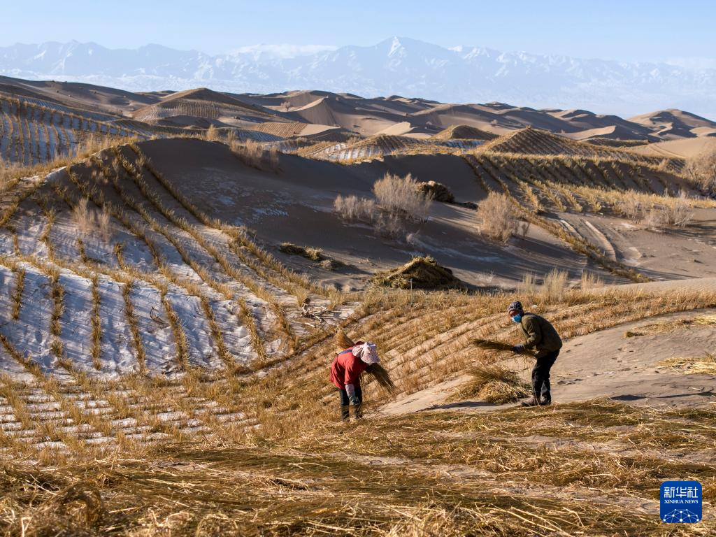 12月13日,施工人员在库姆塔格沙漠铺设沙障。新华社发(高宏善摄)