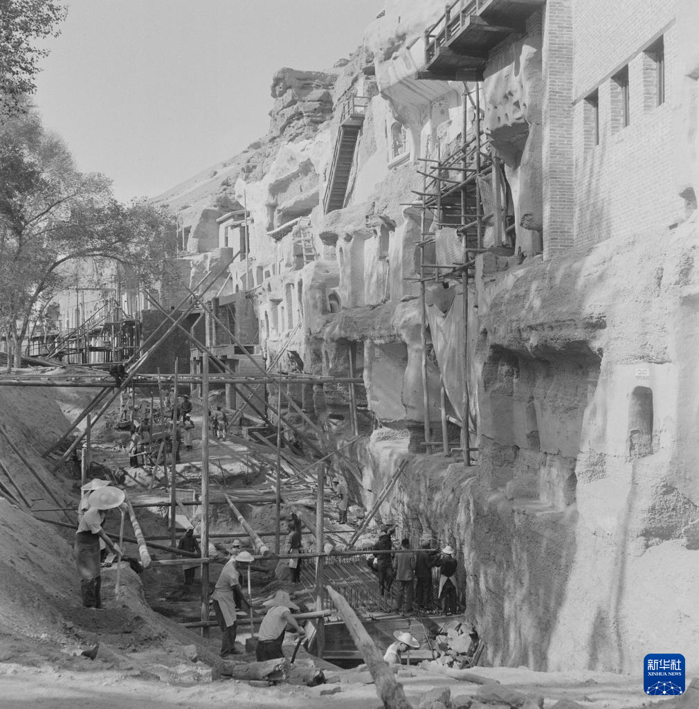 敦煌研究院工作人员对莫高窟部分洞窟进行加固施工(1964年7月8日摄)。新华社发