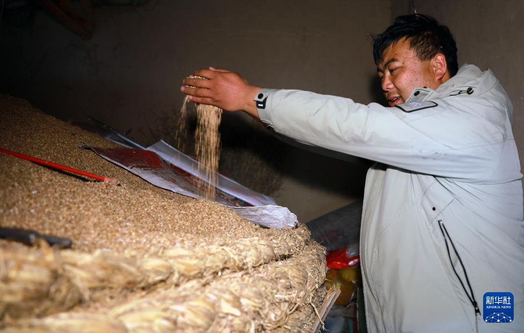 在甘肃省定西市安定区石泉乡,一位村民在展示自家粮仓的麦子。新华社记者 郭刚 摄