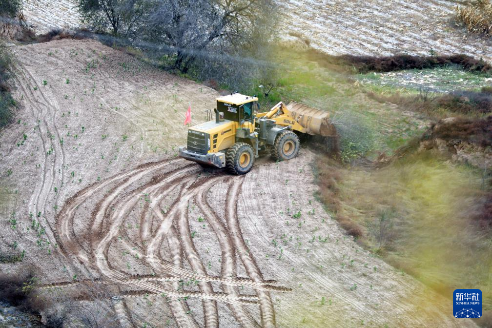 在甘肃省定西市安定区一处高标准农田建设现场,推土机正在作业。新华社记者 郭刚 摄