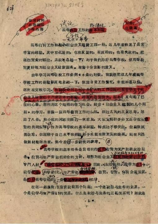 这是江隆基《试论高等学校工作的规律性》打印修改稿首页。