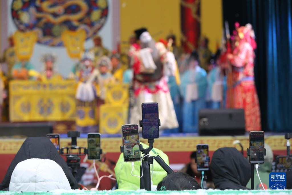 自媒体博主在年货大集上直播秦腔非遗演出(1月19日摄)。新华社发(王克贤 摄)