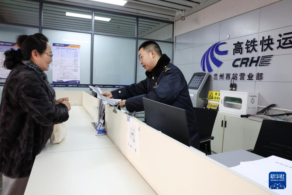 2月1日,中铁快运兰州西站营业部工作人员孙谦(右)为旅客董文琦办理宠物托运手续。新华社记者 陈斌 摄