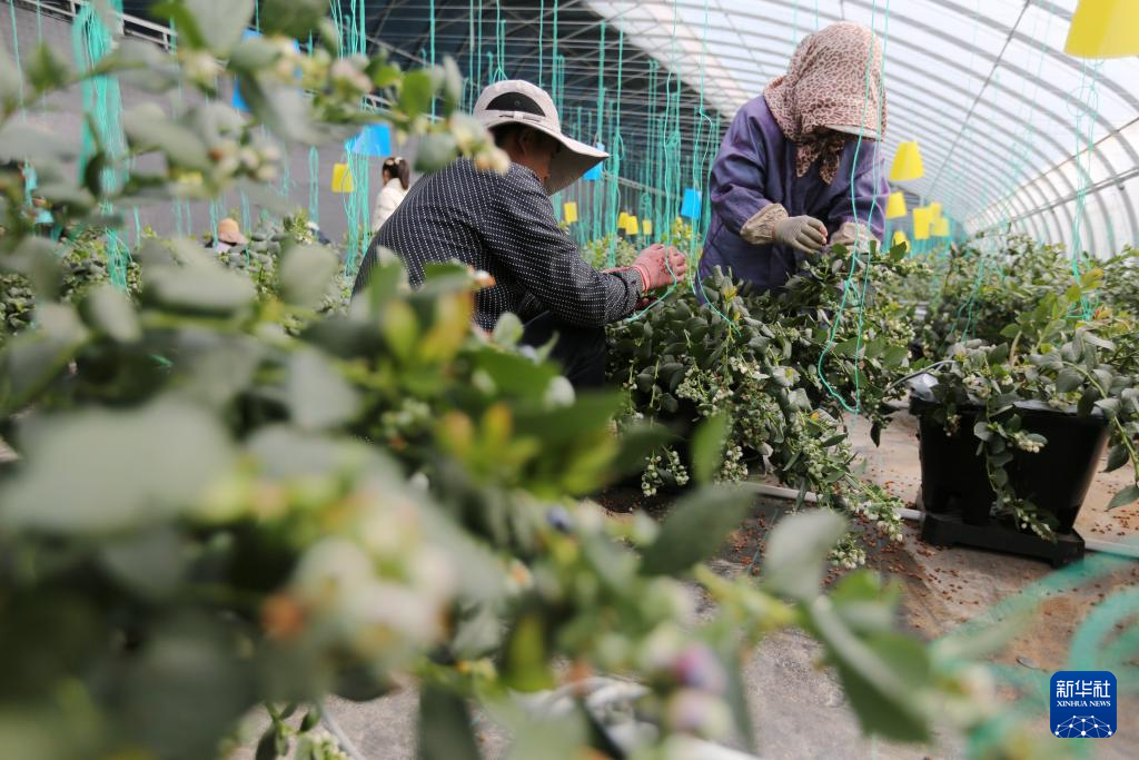 2月12日,两名工人在定西市安定区鲁家沟镇蓝莓种植产业园的温室大棚劳作。新华社发(王克贤 摄)