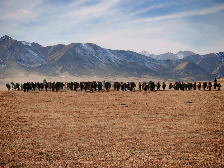 9点半,体弱的马群已饮水归来。此时,大队马群方才正式出发。蹄声清脆,富有节奏,牧马人之间依靠口哨与手势交流,不过分驱赶,不过度干预。马识途,头马领路,整个马群在看似随意的引导中有序流动。