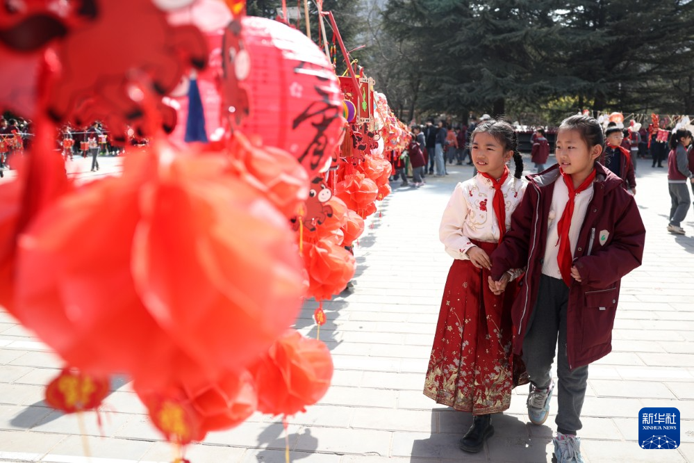 3月3日,甘肃省兰州市东郊学校的学生在校园元宵节民俗活动上观赏同学们制作的花灯。新华社记者 陈斌 摄