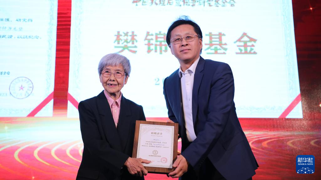 国家文物局党组成员、副局长解冰(右)为樊锦诗(左)颁发捐赠证书。新华社记者张睿 摄
