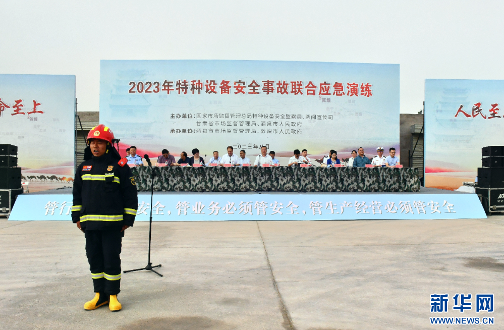 8月30日,2023年特种设备安全事故联合应急演练在甘肃敦煌举行,演练由国家市场监督管理总局特种设备安全监察局、新闻宣传司,以及甘肃省市场监督管理局、酒泉市人民政府主办。