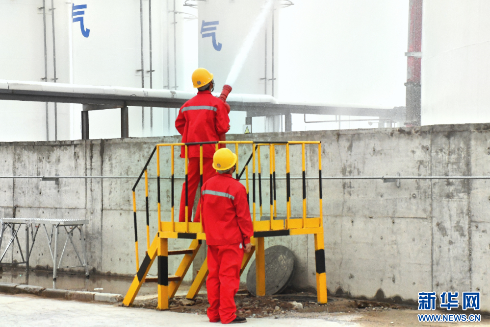 演练模拟某公司LNG调峰储备站储罐出液管件衔接部位突然发生断裂,LNG泄漏,现场出现蒸汽云的情景。模拟事故发生后,公安、消防、卫生、市场监管等部门立即启动应急预案,对火情实施扑救、救治受伤人员,研判、调查事故发生原因等,快速、高效地处置了特种设备安全事故。新华网发(宋昱静 摄)
