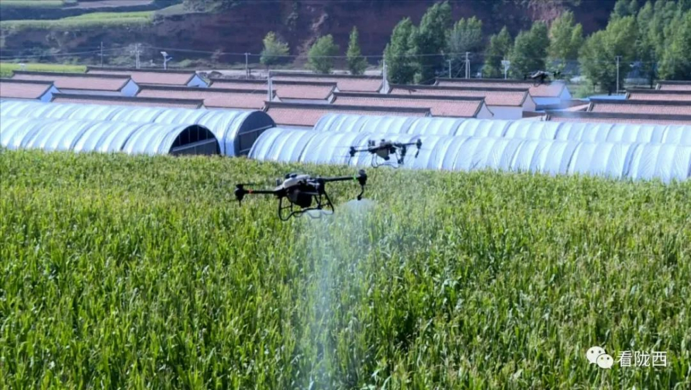 近日,记者在陇西县碧岩镇王庄村受旱情影响的连片玉米种植示范区“一喷多促”“飞防”作业现场看到,15台植保无人机来回穿梭,正在开展“一喷多促”喷防作业,为这片受灾玉米送来了一场及时的“营养雨”。