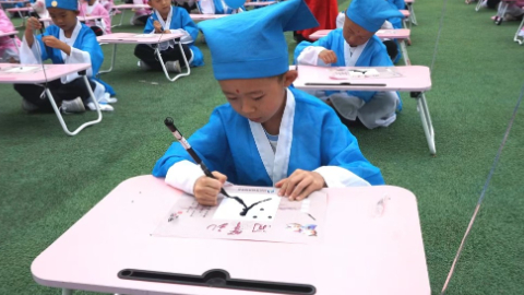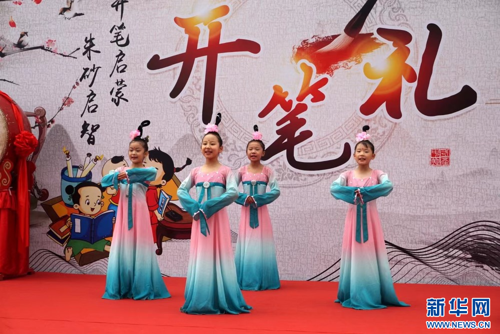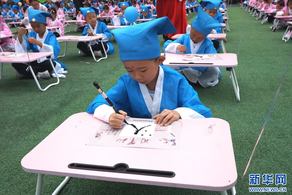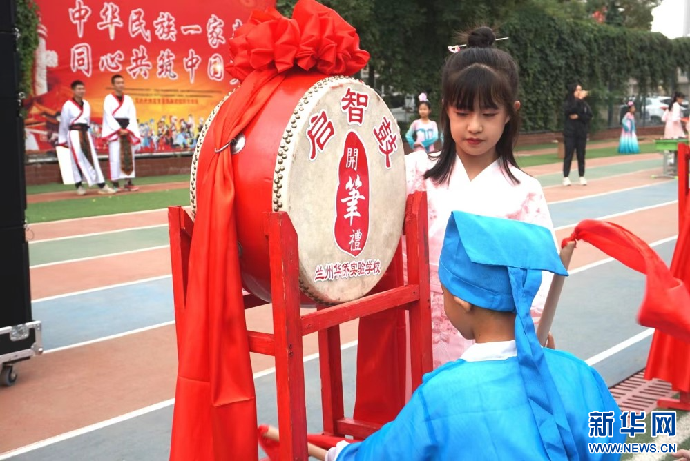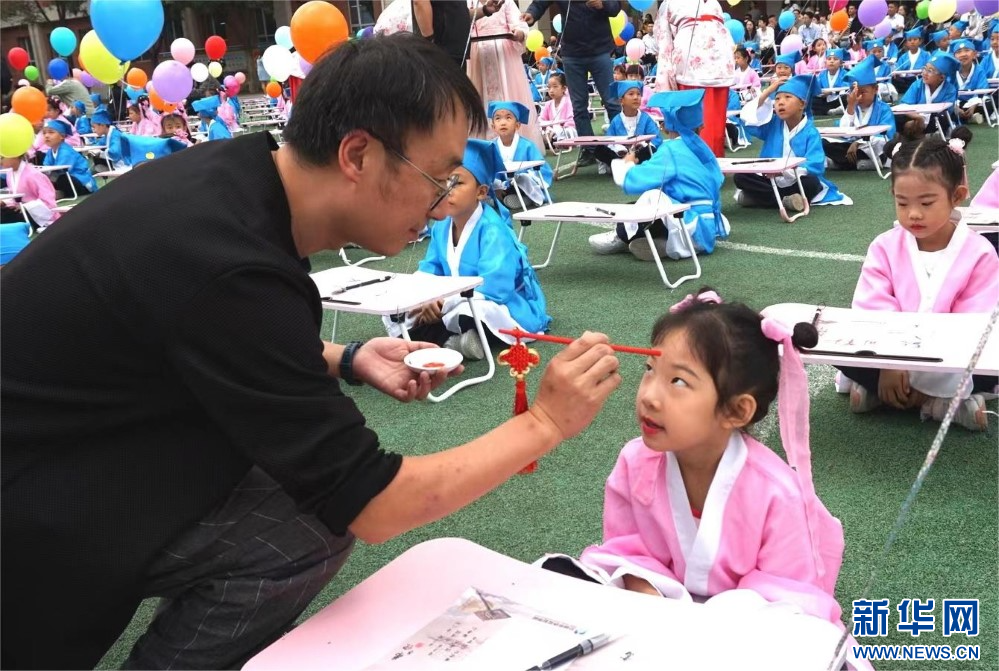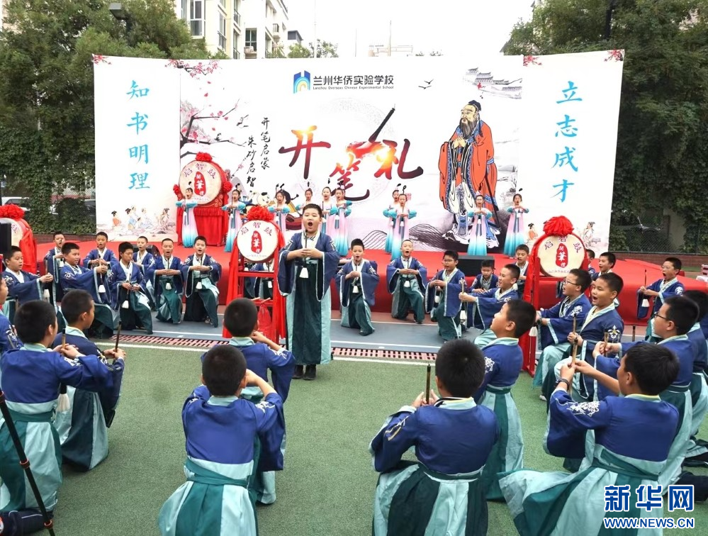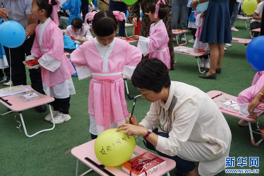 开笔启蒙,朱砂启智。9月8日,兰州华侨实验学校为一年级新生举办开笔礼仪式。小朋友们身穿汉服,在老师的带领下,依次完成了步入求知路、正衣冠、朱砂启智、击鼓鸣志、启蒙描红、礼谢亲师等仪式,家长和孩子共同在气球上写下愿望,放飞理想,开启人生新篇章。新华网发(杨思怡 摄)