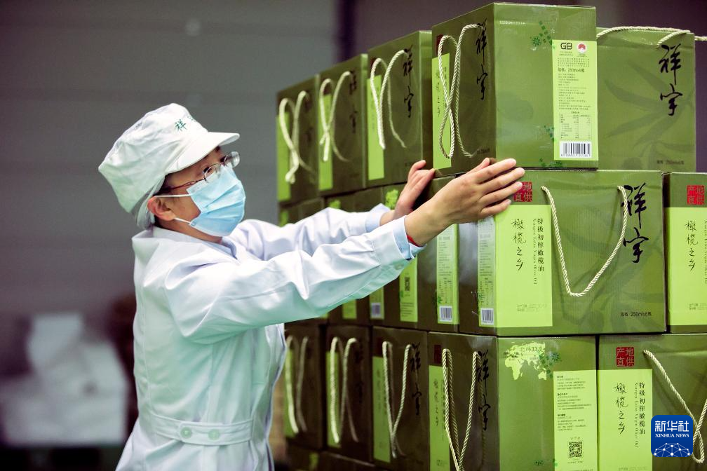 10月11日,在陇南市武都区一家油橄榄加工企业生产线上,工作人员将包装好的橄榄油码放整齐。新华社记者 郎兵兵 摄