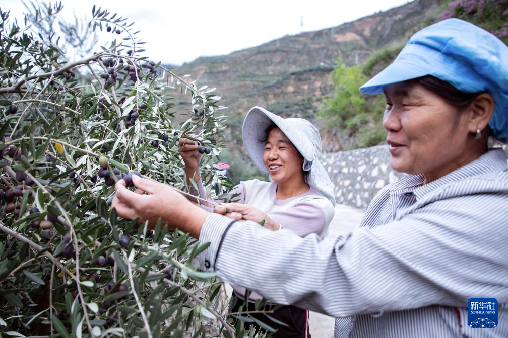 10月12日,农户在陇南市武都区外纳镇稻畦村一处油橄榄种植基地采摘油橄榄。新华社记者 郎兵兵 摄