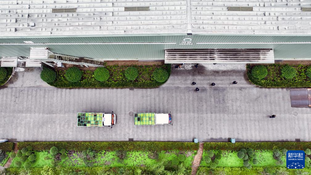 10月11日,满载油橄榄的车辆驶入陇南市武都区一家油橄榄加工企业(无人机照片)。新华社记者 郎兵兵 摄