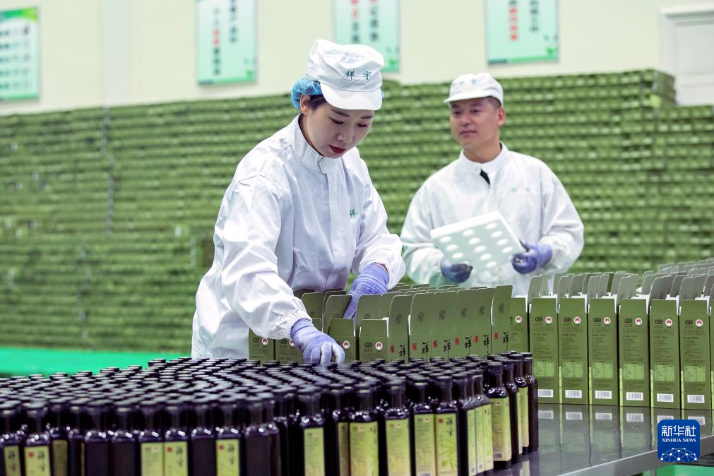10月11日,在陇南市武都区一家油橄榄加工企业生产线上,工作人员在将橄榄油装箱。新华社记者 郎兵兵 摄