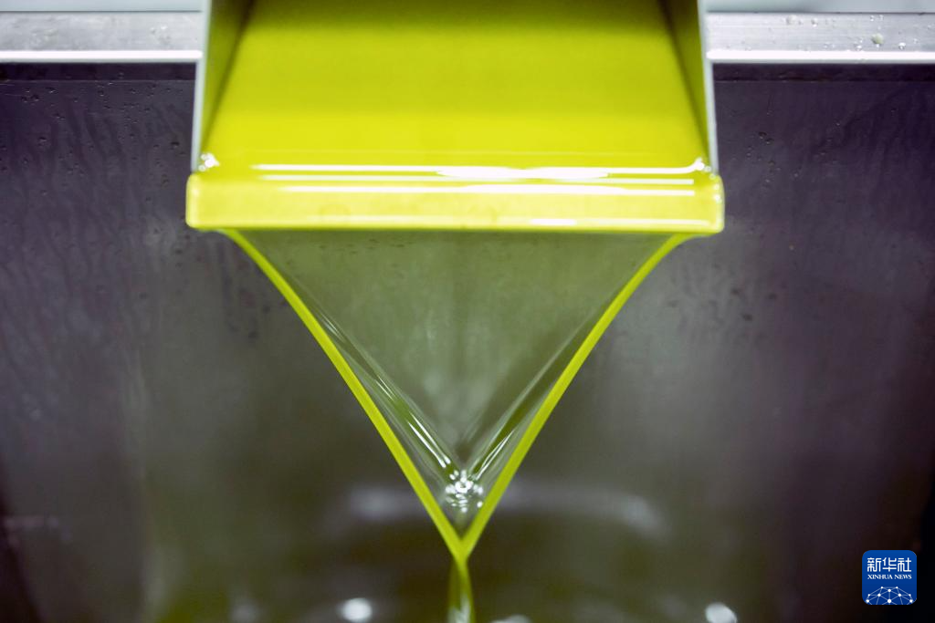 10月11日,在陇南市武都区一家油橄榄加工企业生产线上,初榨橄榄油从机器流出。新华社记者 郎兵兵 摄