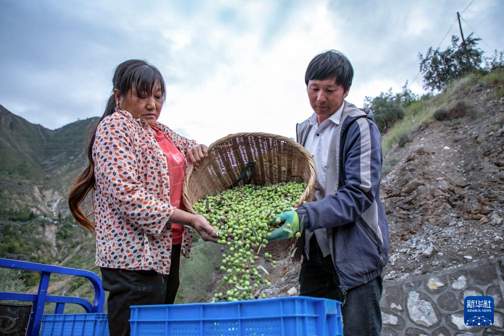 10月12日,在陇南市武都区外纳镇稻畦村一处油橄榄种植基地,农户将采摘的油橄榄倒入收纳箱。新华社记者 郎兵兵 摄