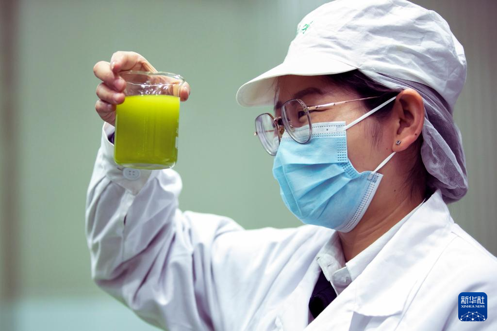 10月11日,陇南市武都区一家油橄榄加工企业的工作人员在观察初榨橄榄油品质。新华社记者 郎兵兵 摄