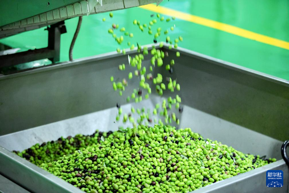 10月11日,在陇南市武都区一家油橄榄加工企业生产线上,油橄榄鲜果被投入到上料仓。新华社记者 郎兵兵 摄