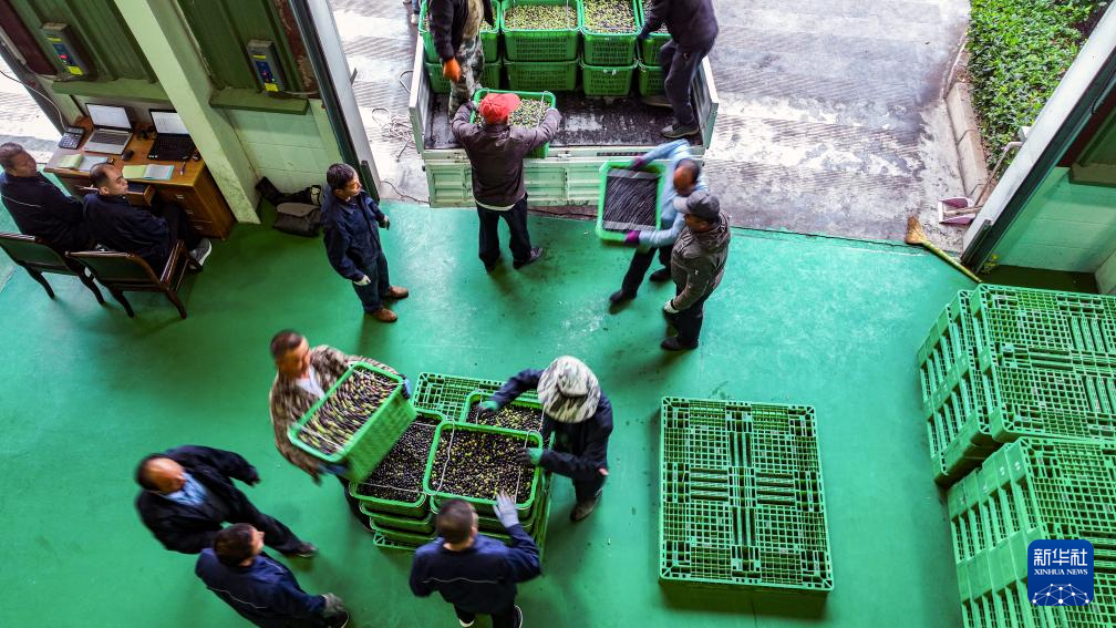 10月11日,陇南市武都区一家油橄榄加工企业的工人在搬运成筐油橄榄(无人机照片)。新华社记者 郎兵兵 摄