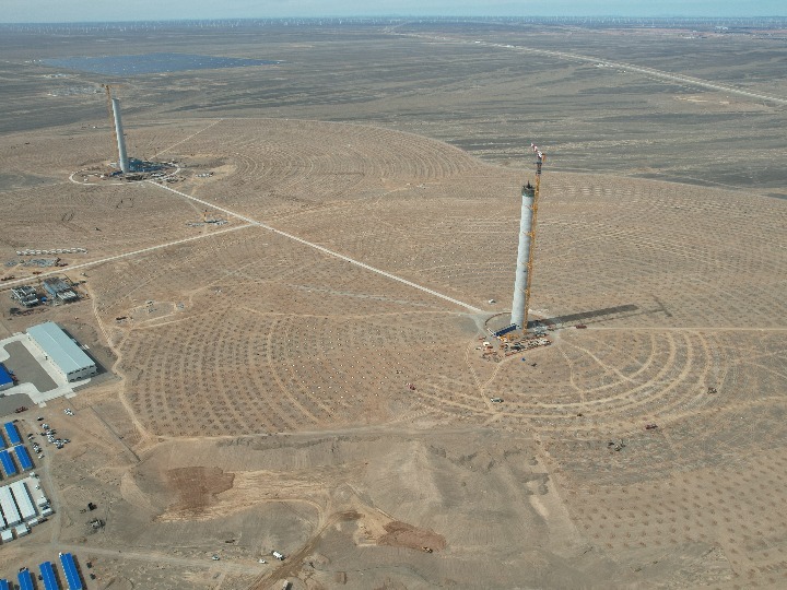 建设中的三峡能源三峡恒基能脉瓜州70万千瓦“光热储能+”项目。(徐萌 摄)
